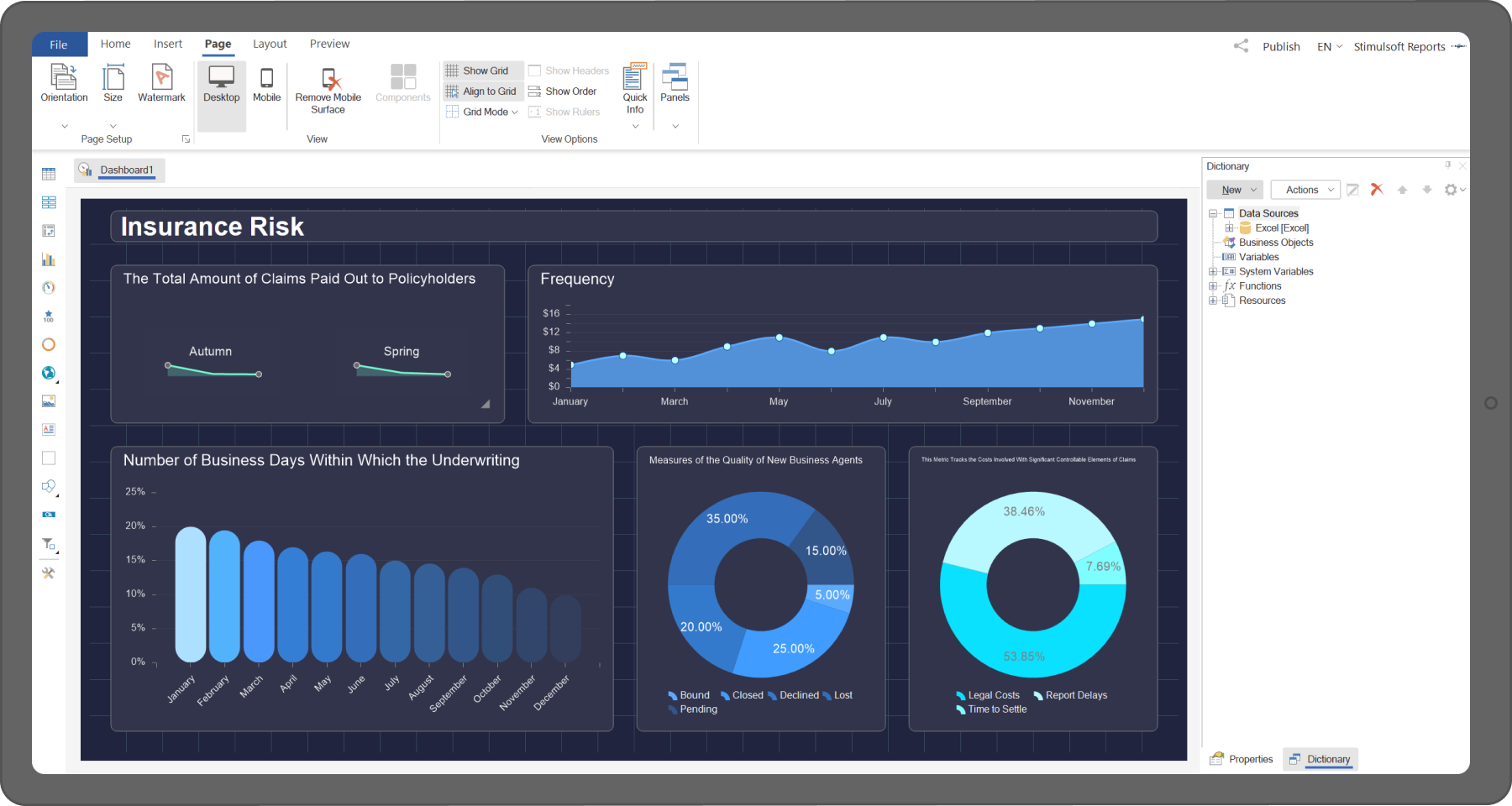 Mit Stimulsoft Dashboards.WEB können Sie verschiedene Typen der analytischen Dashboards erstellen – KPI und HR, Verkauf- und Versicherung-Dashboards, sowie die Panele für Statistik und Marketing. Um die Arbeit schnell zu starten, bieten wir viele professionell erstellten Vorlagen, die in der Cloud-Dienstleistung Demo oder im Berichtsdesigner verfügbar sind.