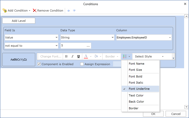 For example, you can make a text underlined for components that contain a Nancy word in the FirstName column. Select a text component with the {Employees.LastName} expression, in the DataBand and call the Conditions editor. Then, you should set a condition: select the Employees.FirstName data column, as the first value, and indicate the Nancy letter, as a second value. Also set the Operation comparison to the not equal to value. Change the formatting parameters, in this case, set the font style to underlined. The picture below shows the Conditions editor dialog box: