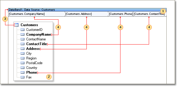 Render a report that prints a list. Put one Data band on a page. Using the DataSource property assign a data source to the band. Put Text components on the band. Make a reference to data fields in each component. For example: