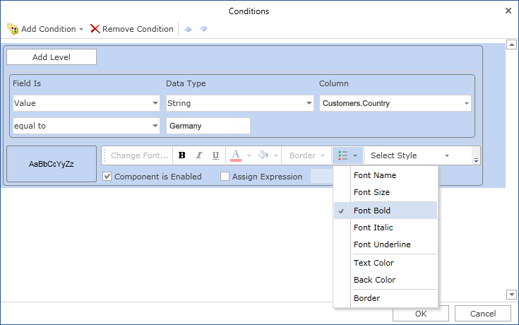 Как видно из рисунка, записи текстовых компонентов в колонке Country содержащие слово Germany, будут выделены жирным шрифтом.