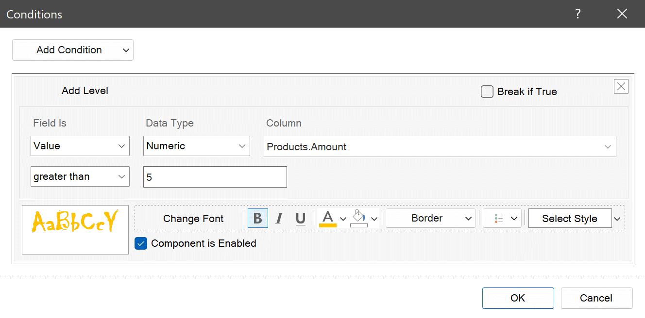 Sie können die Bedingungen (Conditions) für Änderung der Schriftart verwenden. Die Änderung der Schriftart wird beim Ausführen angegebener Bedingung verwirklicht.
