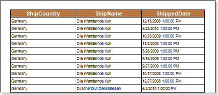 If you want to display information about orders, which were processed in 2008, then use the variable created in the report. To do this, add a filter in the DataBand with the expression Orders.ShippedDate > Variable1.FromDate & & Orders.ShippedDate < Variable1.ToDate. When rendering a report, you will see only the information about orders that were processed in 2008. Below is a report with orders in 2008: