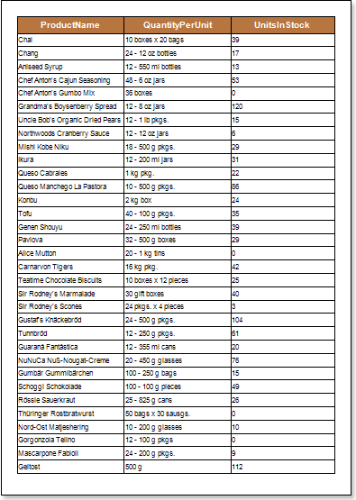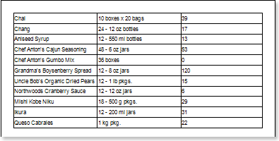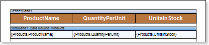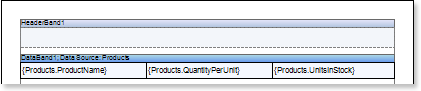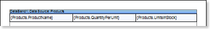 6. Put text components with expressions in the DataBand. Where expression is a reference to the data field. For example, put three text components with expressions: {Products.ProductName}, {Products.QuantityPerUnit}, and {Products.UnitsInStock};