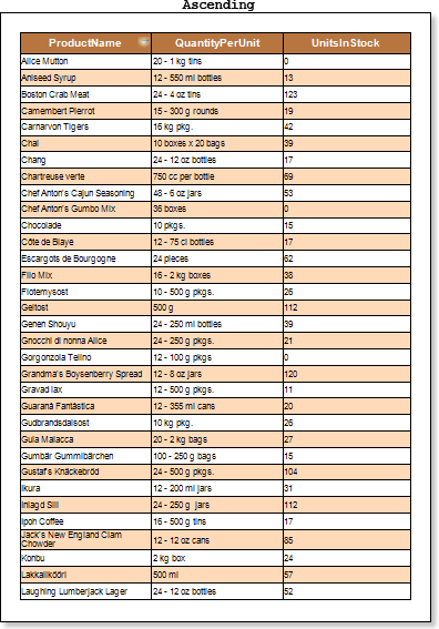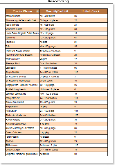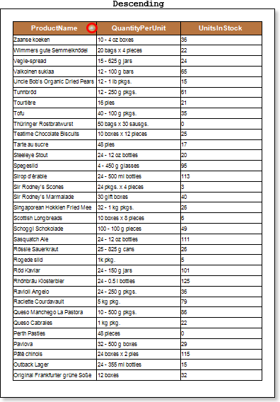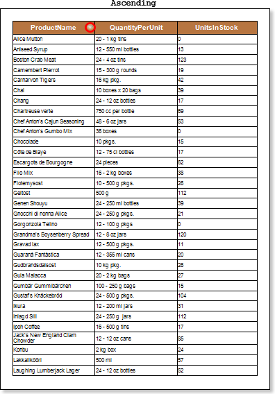 19. To enable sorting of data by the specified data column, you should click a report component which the Interaction.Sorting Column property was set earlier. In our example, you should click the TextBox4. After clicking the text component, data will be sorted in Ascending direction. To change the sorting direction from Ascending to Descending, you need to click the text component again, each time after clicking the text component sorting direction will be changed. The picture below shows the first page of the report rendered with different sorting directions:
