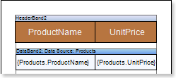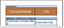 9. Put text components with expressions in the DataBands. Where an expression is a reference to a data field. For example, put the following expressions to the DataBand1: {Customers.CompanyName} and {Customers.City}. put the following expressions to the DataBand2: {Products.ProductName} and {Products.UnitPrice};