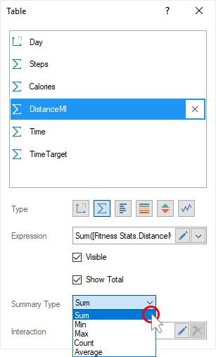 Для полей данных типа Измерение (Dimension) функции агрегирования значений не применяются. Для того чтобы применить функцию к определенному полю, следует установить его тип как Показатель (Measure).