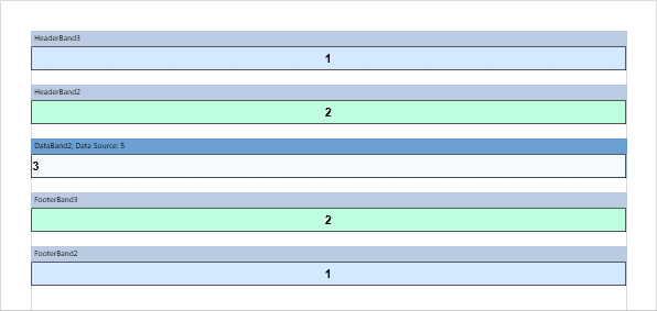 Часто бывает, что количество заголовков и итогов определенного типа, разное количество. Например, изменим пример выше, добавив HeaderBand4 между HeaderBand2 и DataBand2. теперь заголовку HeaderBand4 соответствует итог FooterBand3 (цвет - желтый), HeaderBand2 - FooterBand2 (цвет - бирюзовый), а вот бэнд HeaderBand3 (цвет синий) без итога.: