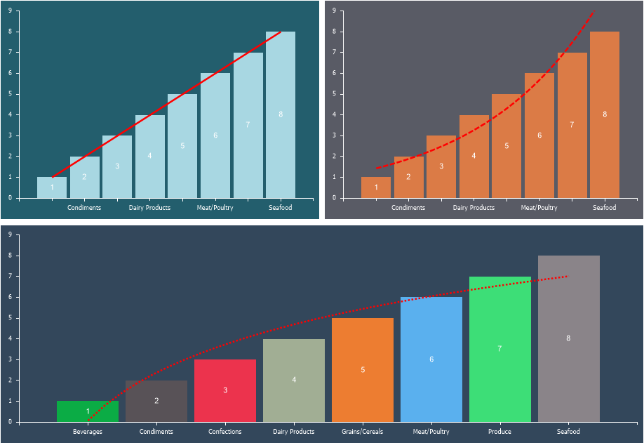 Одним из вариантов анализа и прогнозирования данных является возможность наложения линии тренда на диаграмму. В зависимости от типа, линия тренда предоставляет возможность отобразить зависимость значений ряда от его аргументов. Линия тренда может применяться для рядов без накопления, линейчатых, гистограммах, точечных и пузырьковых диаграммах.