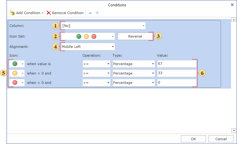 Добавим условие Набор значков (Icon Set). Для этого следует выделить текстовый компонент с выражением {Employees.Country}. Добавить условие Набор значков (Icon Set). Изменить параметры условия. На рисунке снизу представлено окно Условия (Conditions):