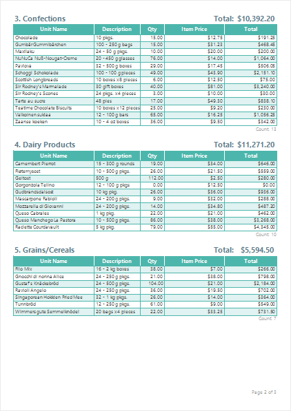 Одной из основных задач при построении отчетов является задача группировки выводимых данных. Группировка может применяться как для логического разделения строк с данными на странице, так и для визуального улучшения вида отчета. Для построения отчетов с группировкой применяется два бэнда – Заголовок группы (GroupHeader) и Итог группы (GroupFooter). Бэнд Заголовок Группы выводится в начале каждой группы. Бэнд Итог группы выводится в конце каждой группы. На рисунке ниже показано как может выглядеть отчет с применением группировки.