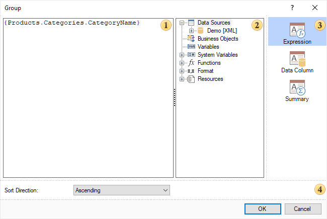 Вкладка Выражение (Expression). На этой вкладке определяется условие для группировки данных и выбирается направление сортировки групп по значениям этого выражения.