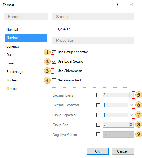 Для отображения числовых значений, можно использовать числовой формат. В этом случаем можно применить группировку в значениях, выделить отрицательные значения, отобразить необходимое количество символов дробной части. Настройка числового форматирования осуществляется в редакторе Формат (Format) на вкладке Числовой (Number).