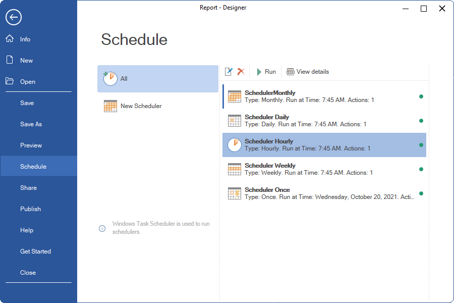 Пункт Расписание (Schedule) в меню Файл (File) содержит список созданных Планировщиков (Schedulers) в дизайнере отчетов, а также команду создания нового элемента Планировщик. Этот элемент предоставляет возможность осуществлять определенные действия с отчетом по расписанию. Например, вы можете автоматизировать процесс построения отчета или преобразования его в определенный тип файла, сохраненить результат в локальное хранилище или отправить его по Email.