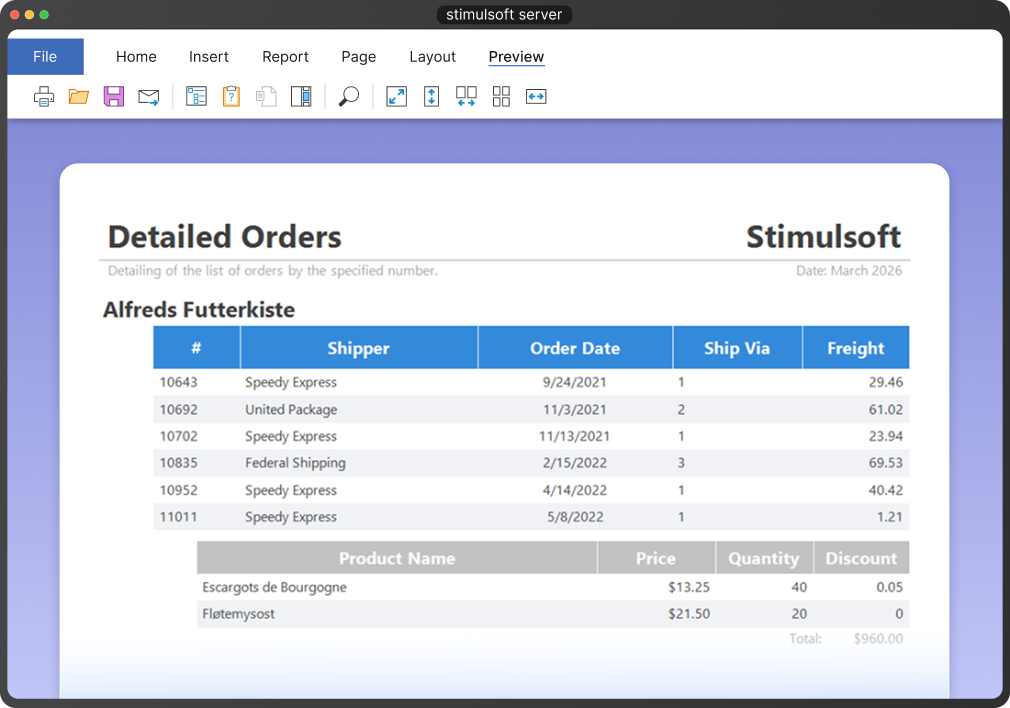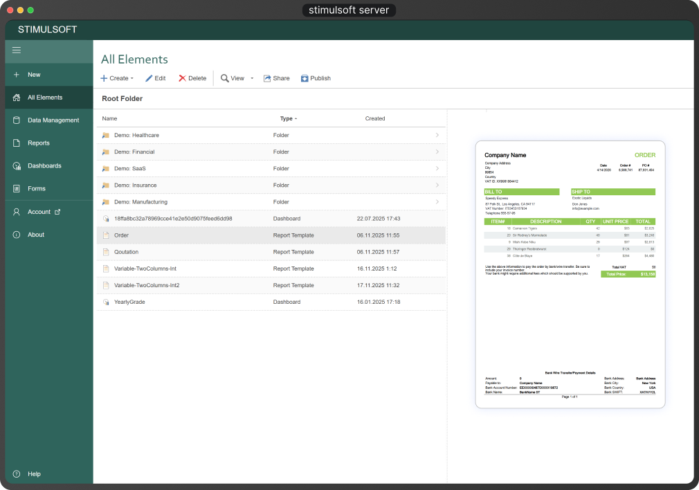 - Built on the Stimulsoft reporting engine - same power, cloud-ready.