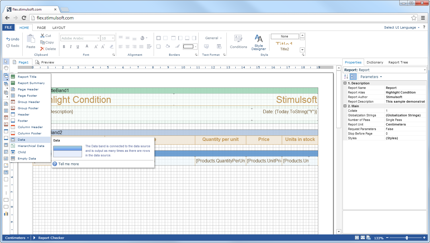 As a part of Stimulsoft Reports.Flex a full-featured standalone report designer is delivered. The report designer is created using the Adobe AIR technology. This gives the opportunity to work on multiple platforms without compatibility issues. Report Designer provides a great number of visual tools for creating reports, thereby reducing the time for reporting. The basis for constructing GUI is the ribbon interface. This makes the report designer not only easy to use, but easy to learn, with the first steps of getting acquainted with our product. In addition to standalone report designer, Stimulsoft Reports.Flex product contains the report designer to launch a browser window on the client side. This version of the report designer has the same functionality as the standalone version. Using the report designer in Rich Internet Application improves its functionality, raises it to a new level. It becomes possible to produce a full report administration directly into the browser window without use of additional desktops, software upgrades and constant use of special administrators.