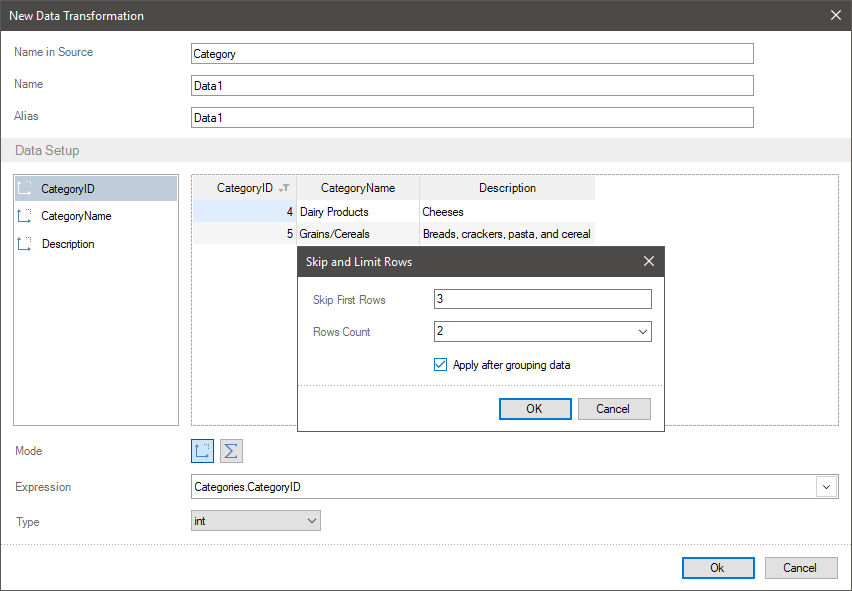 This parameter allows you to apply the Skip and Limit Rows action before data grouping or after that. Accordingly, this parameter is relevant only for data fields, which are grouped by other fields in data transformation. Let`s consider the applying of this parameter when creating data transformation. For example, a data transformation contains a list of categories and a list of product sales, which included in these categories. This way, product sales are grouped by categories.