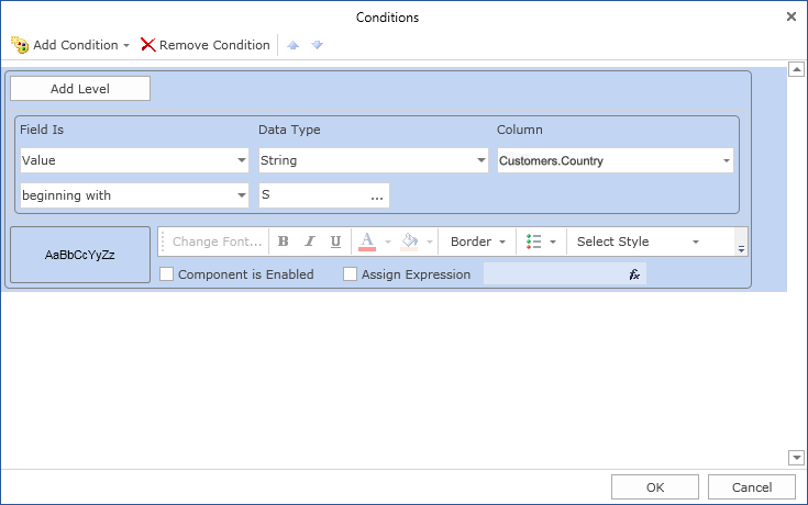 For example, you can hide the text components which contain a S letter in the Country column. Select a text component with the {Customers.Country} expression, in the DataBand and call the Conditions editor. Then, you should set a condition: select the Customers.Country data column, as the first value, and indicate the S letter, as a second value. Also set the Operation comparison to the Beginning with value. Change the formatting parameters, in this case, uncheck the Component Is Enabled check box. The picture below shows the Conditions editor dialog box: