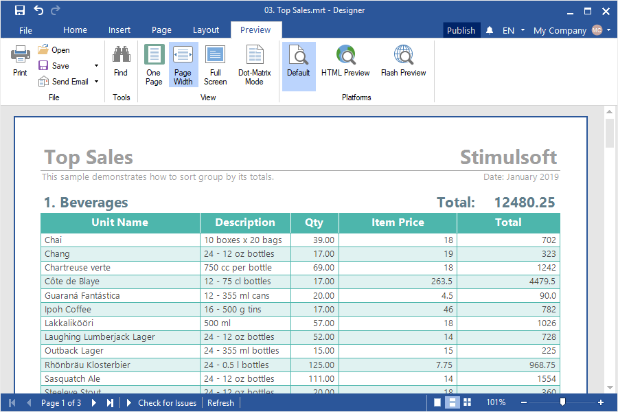Ниже представлен отчет с группами категорий и списком продуктов, их ценой, количеством в каждой категории. По умолчанию все текстовые компоненты используют формат Стандарт (General), т.е. без какого-либо форматирования: