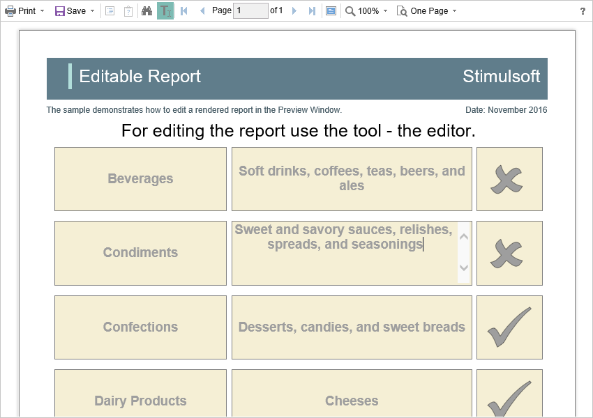Компонент HTML5 Viewer имеет возможность редактировать элементы построенного отчета, такие как текстовые поля и чекбоксы. Для того, чтобы редактирование стало возможным, в самом шаблоне отчета необходимо пометить нужные компоненты как редактируемые. После отображения отчета во вьювере, для начала редактирования необходимо нажать на соответствующую кнопку на панели вьювера. После завершения редактирования необходимо нажать указанную кнопку еще раз, и все внесенные изменения будут примерены к отчету.