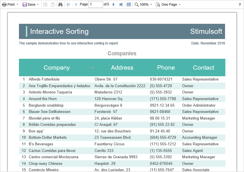 В компоненте HTML5 Viewer реализована поддержка динамической сортировки, сворачивания и детализации отчетов. Динамическая сортировка предоставляет возможность изменять направление сортировки в построенном отчете. Для этого следует щелкнуть по компоненту, у которого была установлена динамическая сортировка. Динамическая сортировка осуществляется в следующих направлениях: По возрастанию (Ascending) и По убыванию (Descending). Каждый раз при щелчке по компоненту направление меняется на противоположное.