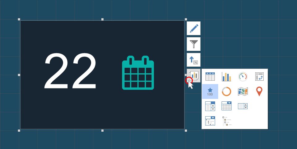 Перетянуть элементы с Инструментария (Toolbox) или вкладки Вставить (Insert) на панель индикаторов;
