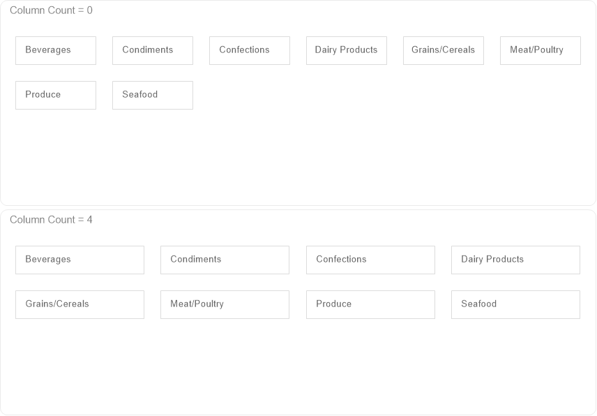 Предоставляет возможность определить направление заполнения колонок элемента карточками. Если свойство установлено в значение По горизонтали (Horizontal), то колонки сначала заполняются слева на право в пределах ширины элемента, а затем осуществляется переход на новую строку. Если же свойство установлено в значение По вертикали (Vertical), то колонки сначала заполняются сверху вниз в пределах высоты элемента, а затем осуществляется переход в новую колонку справа. |