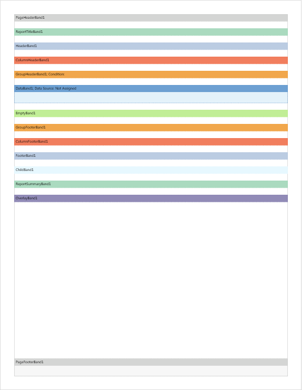 Бэнд Подчиненный (Child) может располагаться под любым бэндом, кроме Заголовок страницы (Page Header), Итог отчета (Report Summary), Итог страницы (Page Footer). На рисунке снизу представлена страница шаблона отчета с расположением бэндов: