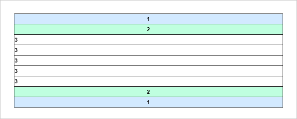 Часто бывает, что количество заголовков и итогов определенного типа, разное количество. Например, изменим пример выше, добавив HeaderBand4 между HeaderBand2 и DataBand2. теперь заголовку HeaderBand4 соответствует итог FooterBand3 (цвет - желтый), HeaderBand2 - FooterBand2 (цвет - бирюзовый), а вот бэнд HeaderBand3 (цвет синий) без итога.: