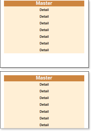 На рисунке сверху, приведен пример отчета, на котором у Master компонента свойство Держать детали вместе(KeepDetails) установлено в значение истина (true). Если и на следующей странице не получится их разместить вместе, тогда данные будут принудительно разбиты и выведены на разных страницах. При этом, если у Master компонента есть много Detail записей, которые занимают значительное место на странице, и свойство Держать детали вместе (KeepDetails) установлено в значение истина (true), то возможно наличие большого пустого места внизу каждой страницы.