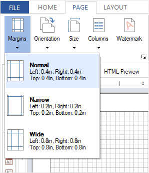 Как правило, текст и другие элементы отчета размещаются в области печати. В тоже время, на полях можно размещать элементы. Например, текстовый компонент с функцией вывода номера страницы. Размер полей можно изменять, выбрав одни из предустановленных полей или задав произвольные. Предустановленные варианты полей можно выбрать на вкладке Страница (Page) в меню Поля (Margins). Произвольные поля задаются при помощи свойства Поля (Margins) у страницы.